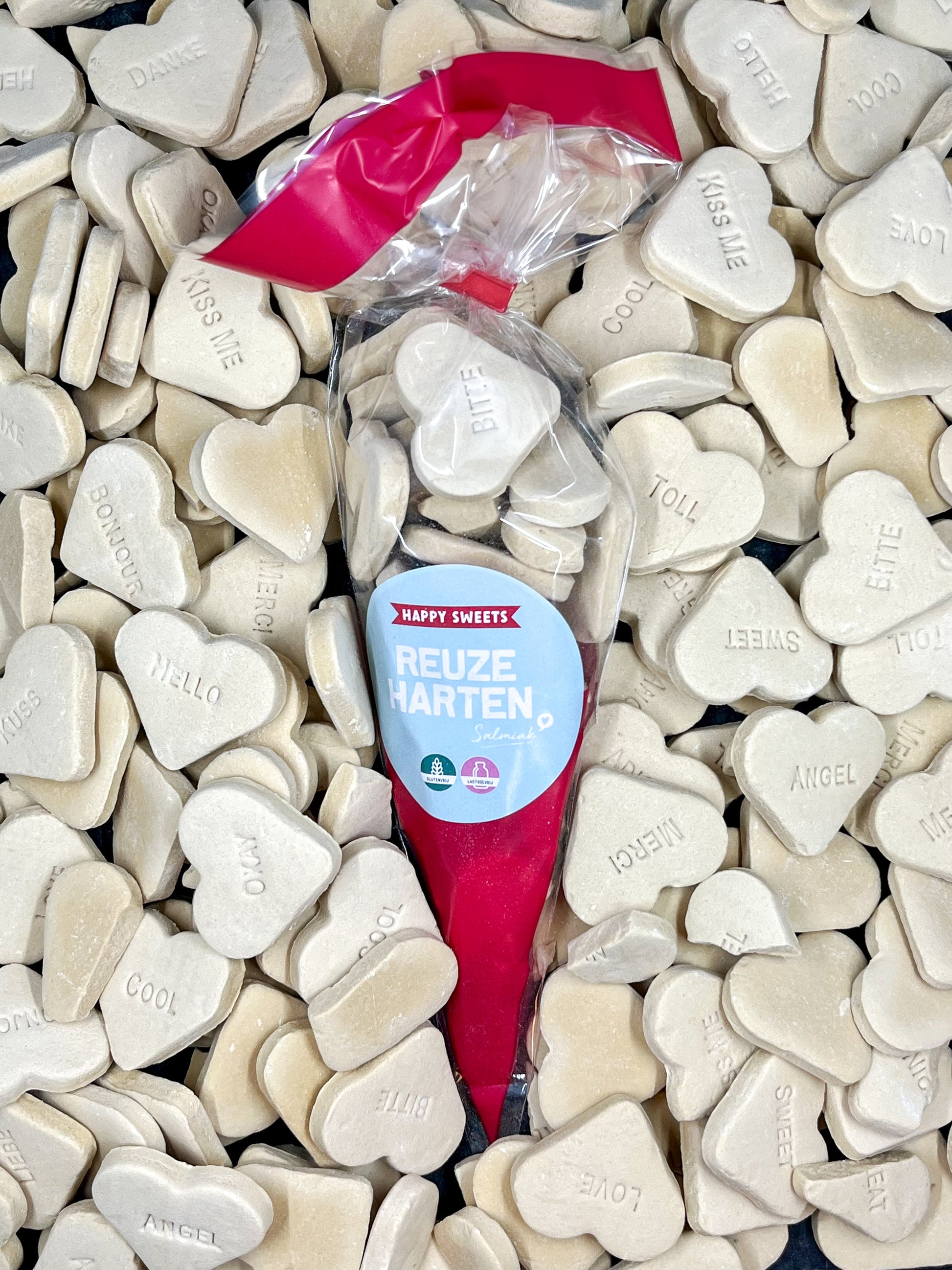 Liefde in snoepvorm! Onze **reuze harten** zijn zacht, zoet en lekker groot. In een heerlijke Salmiak smaak. Perfect om cadeau te geven aan iemand die je lief hebt – of aan jezelf natuurlijk ❤️. Want liefde gaat ook door de maag!