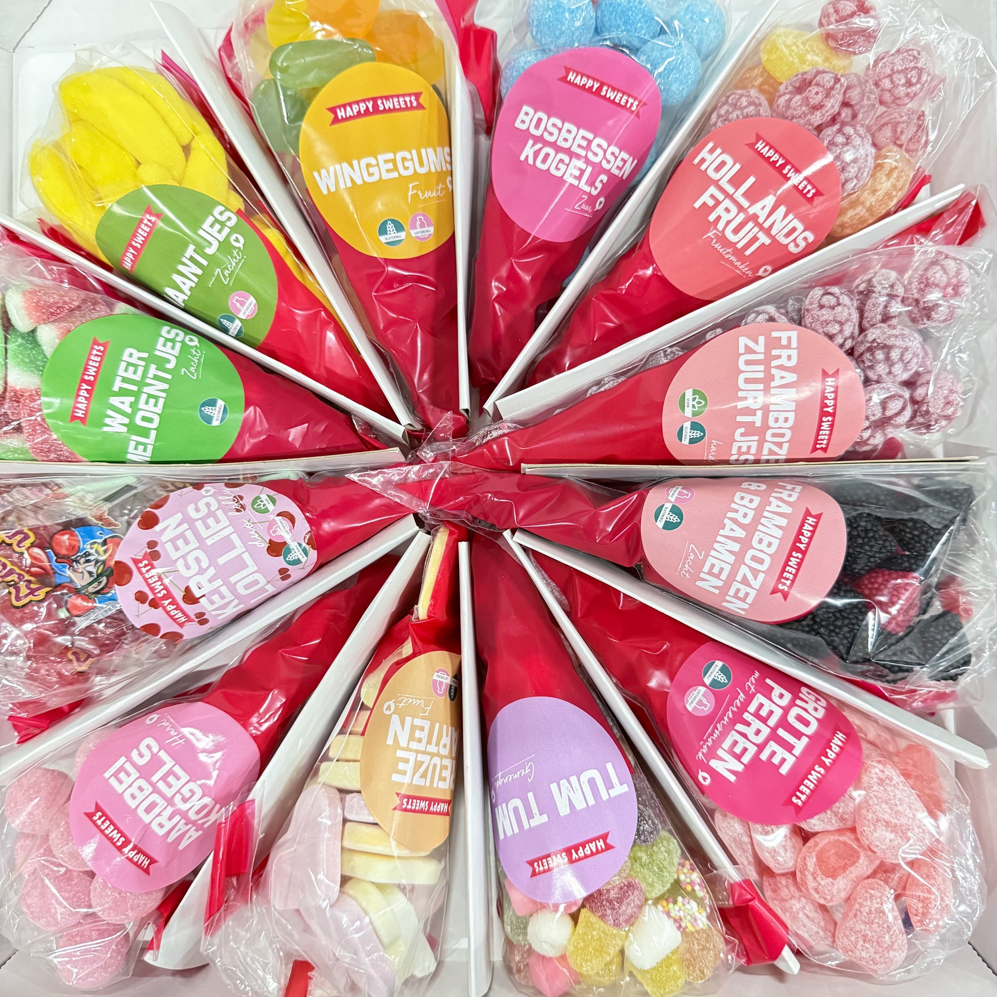 Met de 12 lekkerste fruit puntzakken uit het vrolijke assortiment van Happy Sweets, met korting!!t.